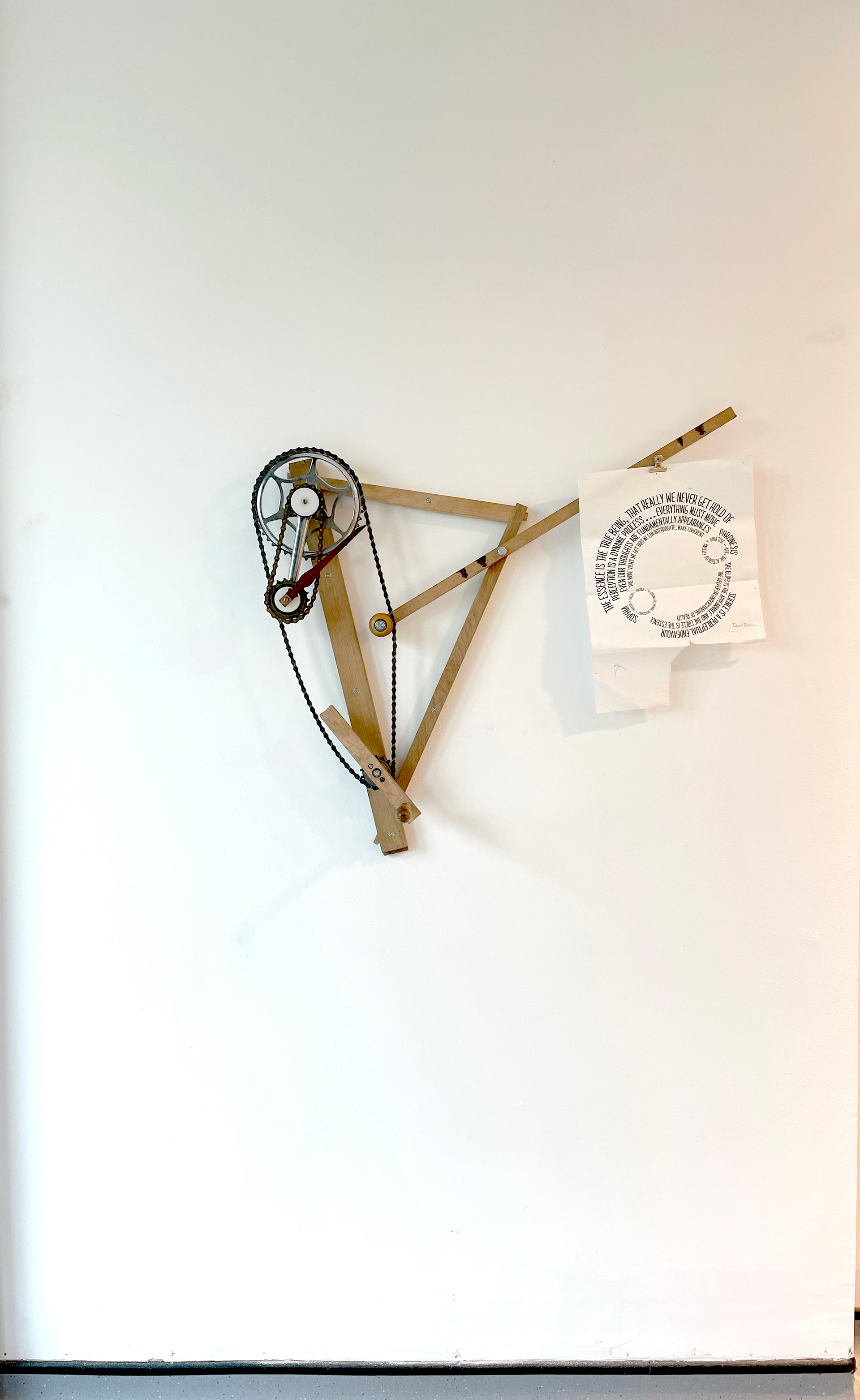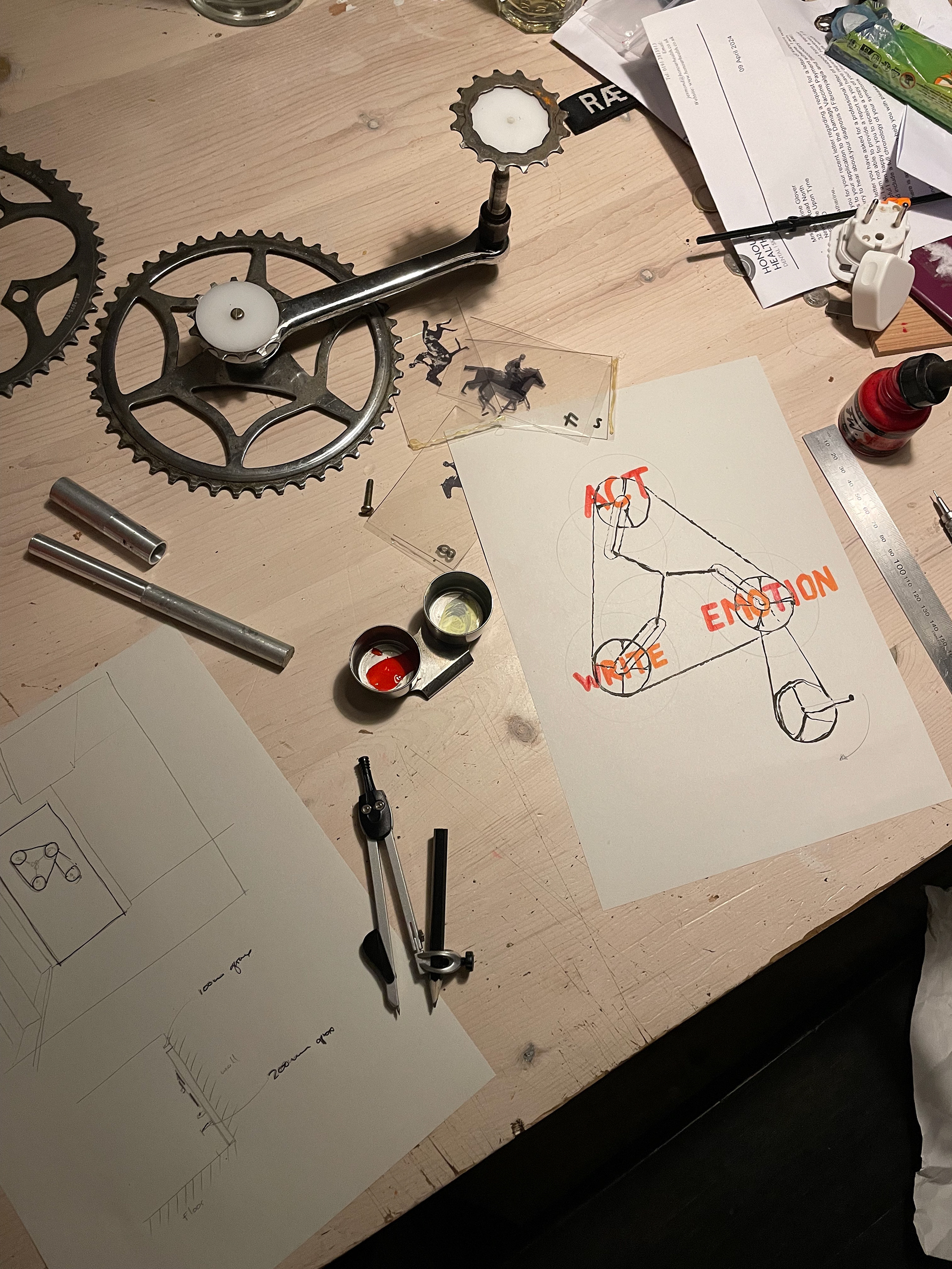 Beginning with the handle (emotion) which drives the ‘Attention-o-meter’ through which the initial emotions are amplified back and forth, round and around. The third phase is a tensioner, through which emotional labour is translated into words. These words (motion) emerge from the gumption, but are not the same, they are shadows and reflections of action.